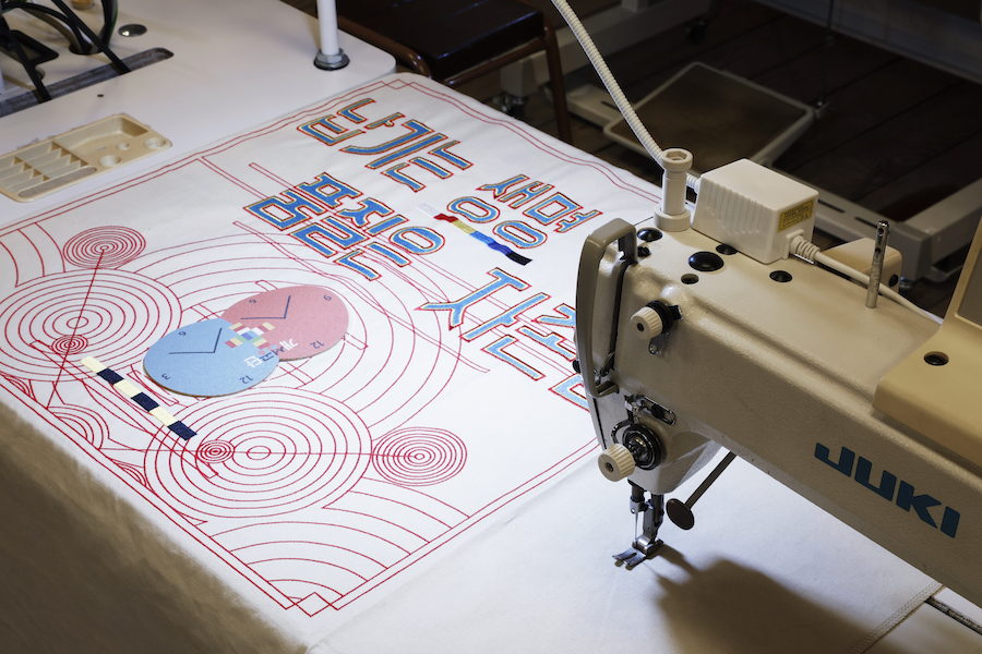 In Lee Boo-rok’s replica of a garment factory, Robo Cafe, rows of tables with sewing machines fill the space, covered in tablecloths on which slogans about productivity are being sewn. Im Heung-soon’s video work Brothers Peak portrays the artist climbing up a mountain while carrying a coffin, accompanied by the resonant singing of the Seoul-based gay chorus G-Voice and Lee Hyang, an accordion player who is a North Korean defector. In his installation, Yoo Soo shows actual gifts exchanged between North and South workers, asking us to reflect on the fundamental meaning of the Kaesong Industrial Complex by exaimining the gifted items. *Photos by Takeru Koroda