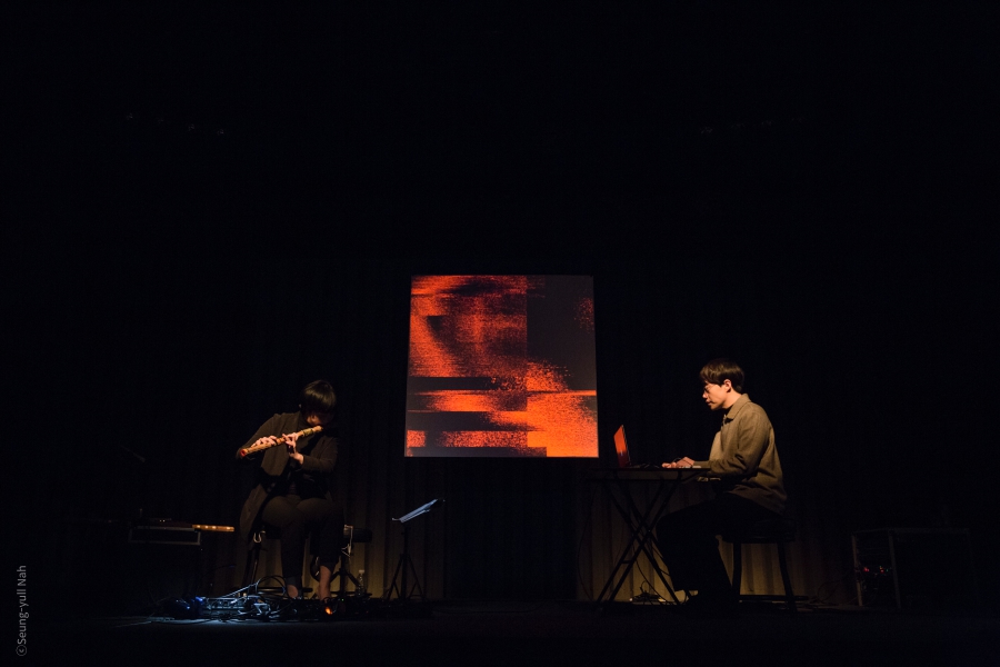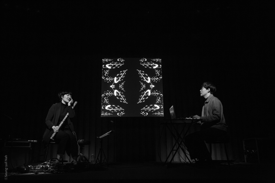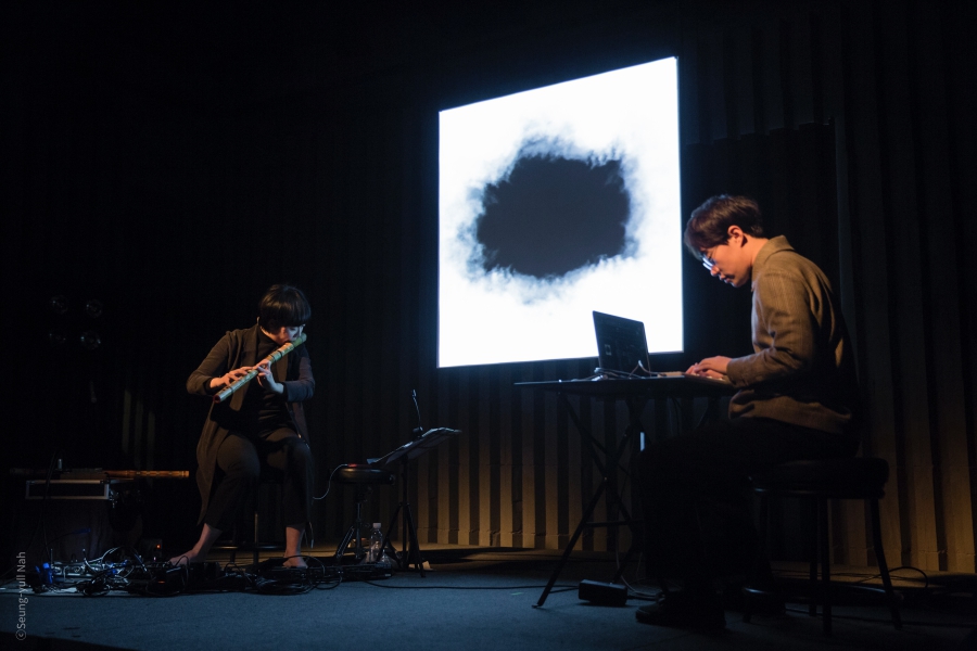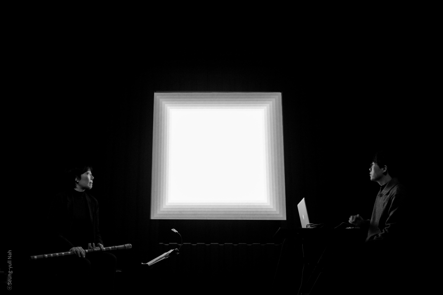 The act of looking out, starting with gazing at things outside the ‘gate’ which in turn becomes an observation, provokes a question and even ventures into an abyss. Daegeum (traditional Korean bamboo flute) artist Cha Seungmin and visual artist Lee Seonguk’s ‘Eye Gate’ starts questioning the possibility of two different forms of media to have an equal status. It then gazes at, contemplates and observes what is beyond the 〈gate〉 (It is not only about eyes and a window but also about a question and answer.) and discovers the relationship among the beings it encounters that are projected and mutually responsive. Finally, the discovery becomes a visual and aural presentation as a piece.