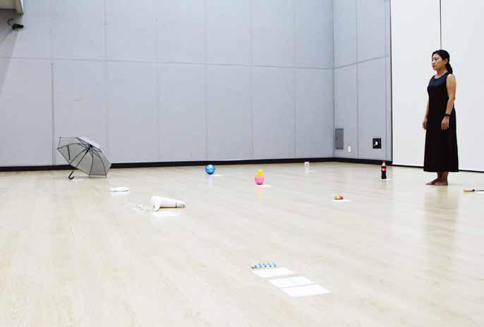 A. As the title states, Combining and Placing+, means combination and placement. This project reflects how when you add one to another or place one next to another, you can break the inherent character of the one or our fixed views that are so firmly in place. This project was the result of massive research. I started it when I collaborated with Gwangju artists from the 2013 Gwangju Asia Art Theater. Back then I came across graphic designer Ahn Sangsoo’s writing on techniques of Chinese character formation and Japanese haiku. Ahn had concluded that these two techniques were similar to a film’s montage technique, and I found the technique of adding A and B and arriving at an expected result so interesting that I decided to research the topic. Also, I wondered if this kind of combination and placement method could be discovered in people’s lives, so during my research phase, I went to several places in Gwangju and saw the combination of the everyday objects senior citizens made. I discovered from these combinations a very unique way of combining. It was the combination method that came out of an individual logic that was different from societal logic. There were many times hile experimenting with artists that I saw absolutely strange combinations like this. And as I researched further, when B was added to A, it resulted in A’s combination form; in short, in the case of words, it became a grammar form; in the case of objects, it became a functional form. A’s combination form was applied to B, then B would go through the test of becoming something new that hadn’t been combined before. As it progressed this way, the scope of the research grew immensely; at the same time, the research process inspired me. But as I worked on researching words and objects and other diverse media and then moved over to movement research, I faced difficulty because movement itself is such an abstract media. Then I would add to one body two elements of movement or I would introduce a new combination between movement and sound, or initiate a new combination that showed a special relationship between movement and an object. For example, for the act of throwing, I “combined” it with cotton instead of a ball, so when the object was thrown, there was an unexpected result. When we go through the motion of throwing something we usually think the object will travel far, but in my project, the performer threw a specially made object that prevented it from going far, drawing an unexpected parabola. Another example is when you look at a certain movement, you naturally connect a corresponding sound to it, but I try to make something operate in a different manner with different workings. After the performance of Combining Placing+,, I took this project’s research method and carried it over to a research project with many rising artists from different fields—film, music, dance, and theater. There was a musician who added a musical symbol to the text during our research. Another artist whom I worked with on a project with people with disabilities added braille to the text. You can call these combination methods “Combining Placing” format. This creative method has continued to have a profound effect on my projects after 2016. I will continue to look for ways to find symbolic systems that work in concert with each other, like text and musical symbols or braille and text, and ways to create new actions between them.