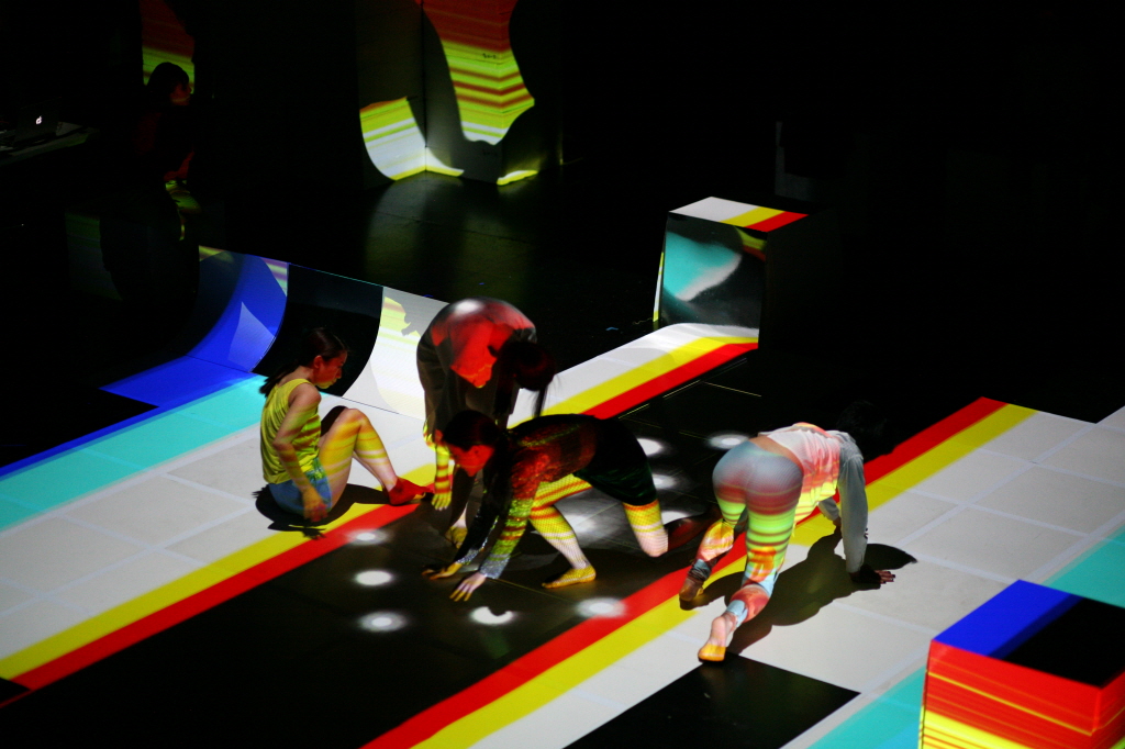 A stage project that combines analogue media (body and space) and digital media (visual projection and sounds)