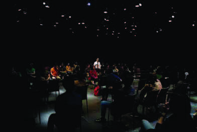 Audiences looked like members participating in a debate over science in Origin of Belief 2 and delegates attending the council meeting in Coriolanus. While the space of theatre and that of audience overlapping, the eyes of the audience are not focused on one spot. The purpose of it is to construct an environment for theatrical thought?
