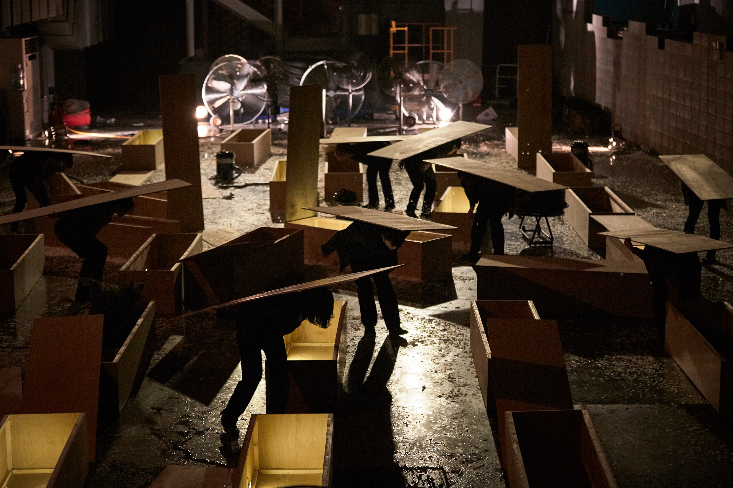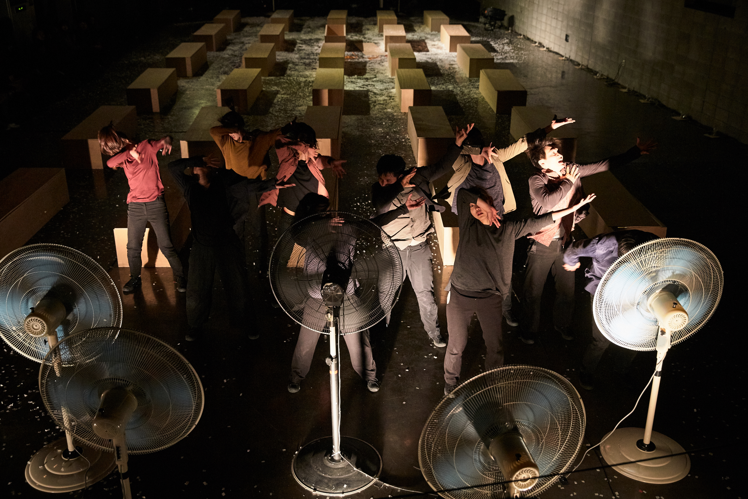 Those who failed to enter their graves lose destination and hover in time and space where life and death co-exist, like the coffins scattered on the stage. Coffin, grave, wind, and opposing movement are the main components of the performance. Through these four elements, it shows the sense of lethargy and despair of our contemporaries living today.