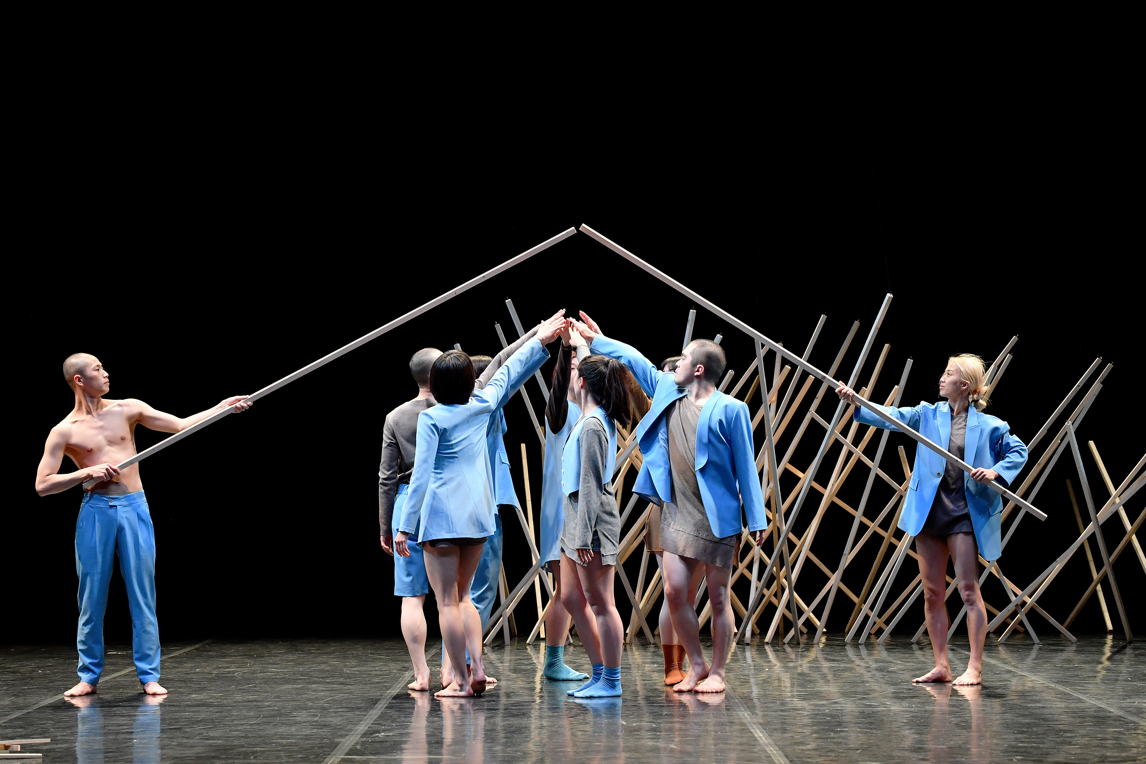 We started from the question of whether our lives are truly “at peace,” the meaning of the word annyeong. Each time I go overseas for a performance, people ask me whether I’m from North Korea or South Korea, which awakened me to the fact that I’m a citizen of a divided country. It then led to the question of how the people of the world’s last divided country can meet one another. “Annyeong Hello!” is about whether we can find peace in a life that is like walking a tightrope amid the anxiety forced on the individual by society through things like national division, war, refugees, migration, and the failure to settle down after migrating. The biggest theme was national division: The performance moved toward the meeting of people, which did happen — but as a dream that is broken down in the end. Another theme was “unfinished house.” Wooden planks, a common building material in the postwar years, take on various roles in this production: As a house, a line that connects people, a border, or a line that blocks two people from maintaining a relationship. Each time we work on a production, I try to achieve a fluid connection between the choreography, stage art, and costumes — something that “Annyeong Hello!” pulls off beautifully. It’s why I decide on the material(s) to be used simultaneously with the choreographic theme. To emphasize the connection between these, we give a lot of attention to choosing the props and costumes.