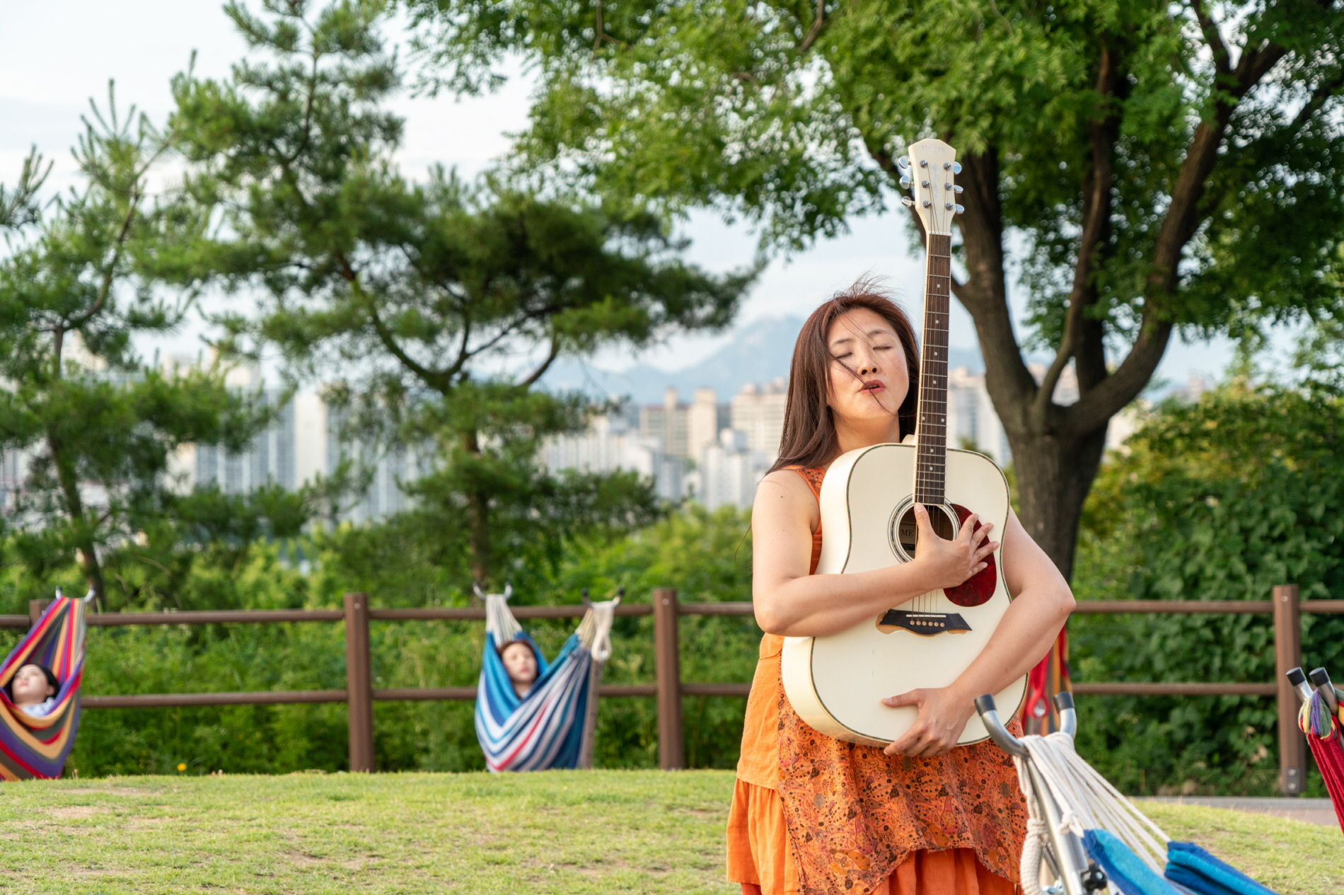 Q. You have explored different places to perform. How do you find performance spaces? Is a space an important material for a work?KIM Jinyoung: Selection of a space is linked to daily experiences. Depending on what we experience and how we are inspired in dailylife, we choose a performance space. "Voice Caves in the City" was first created at Seoul Street Arts Creation Center. The place where the performance took place used to be an intake station. This is a very big place. The sounds I generate there climbedthe walls to make me expand. I was surprised to see that a human sound can expand that way. In that space, a sound expanded without any limit. Believing that such an experience would be necessary for all of us who become smaller every day, I began to create "Voice Caves in the City". On the other hand, "Breath of Lullaby" is different. I like to go camping and I often visit parks. One day, I was lying down in a pavilion inside a park. At thatt ime, I thought of the performance. I realized that our auditory sense becomes different when we are seated and when we are lying down in nature. When people are lying down on hammocks, they seem to become carefree and vulnerable like babies. In such a situation, their senses become more subtle and sensitive.Through this performance, we wanted the audience to sense sounds with such subtleness and vulnerability. So we decided to have them lie down on hammocks.