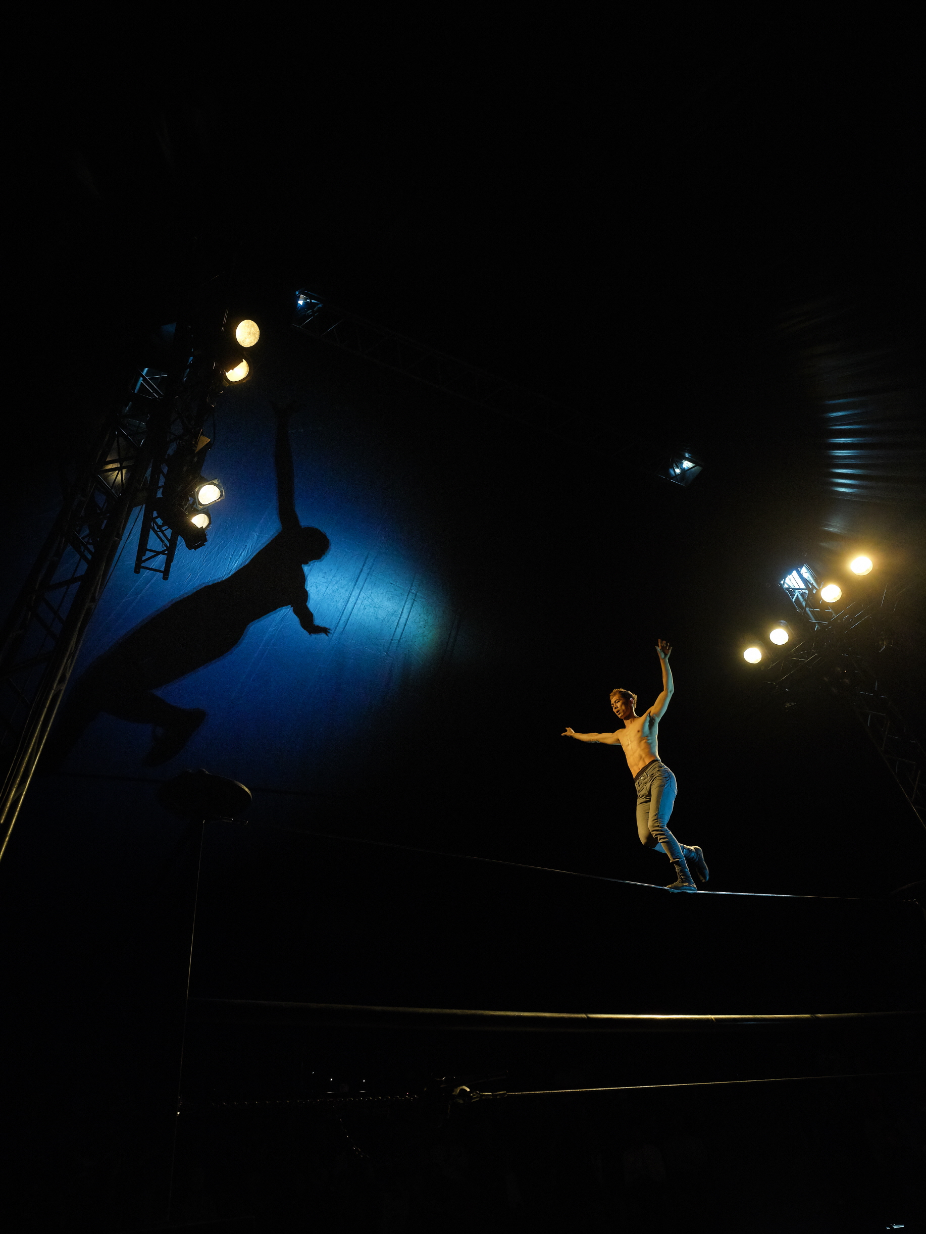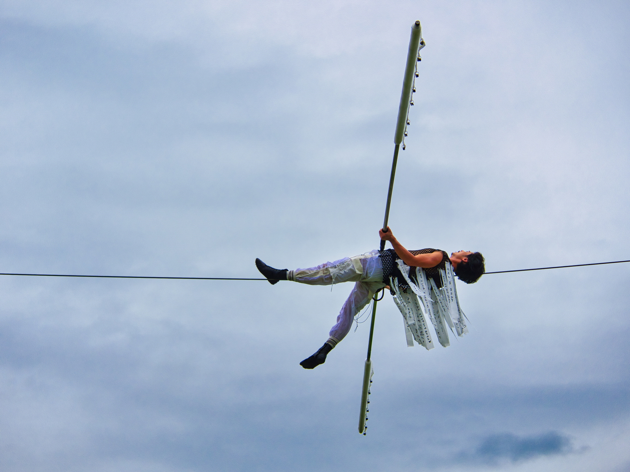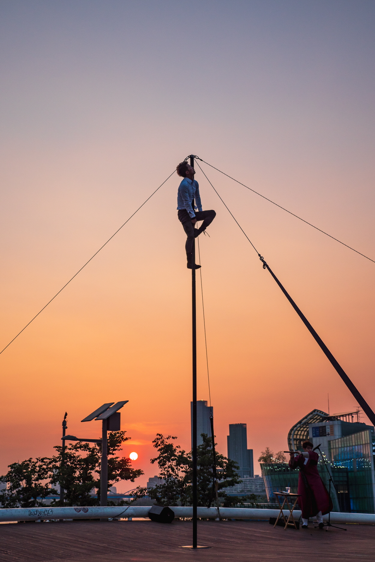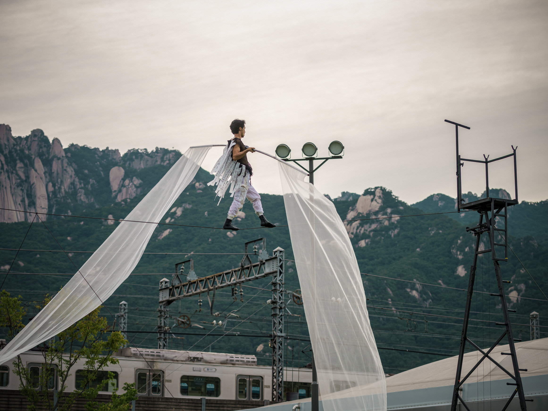 I haven’t done traditional Korean tight rope walking but I saw some masters doing it. They asked me where I had learned Western tightwire walking. In my view, the biggest difference between Western and Korean tight rope skills is found in the energy used for movements. A Korean tight rope requires many dynamic movements going up and down. In contrast, Western tight wire generates more static movements going back and forth. In other words, the directions of the movements are different. And I use two kinds of wire: slack wire and tight wire. Slack wire makes me use the lower parts of the body more than the upper ones and for tigh twire, the opposite is true. This may not be a perfect explanation but to give you an image, slack wire is similar to Korean dance and tight wire, to ballet.
