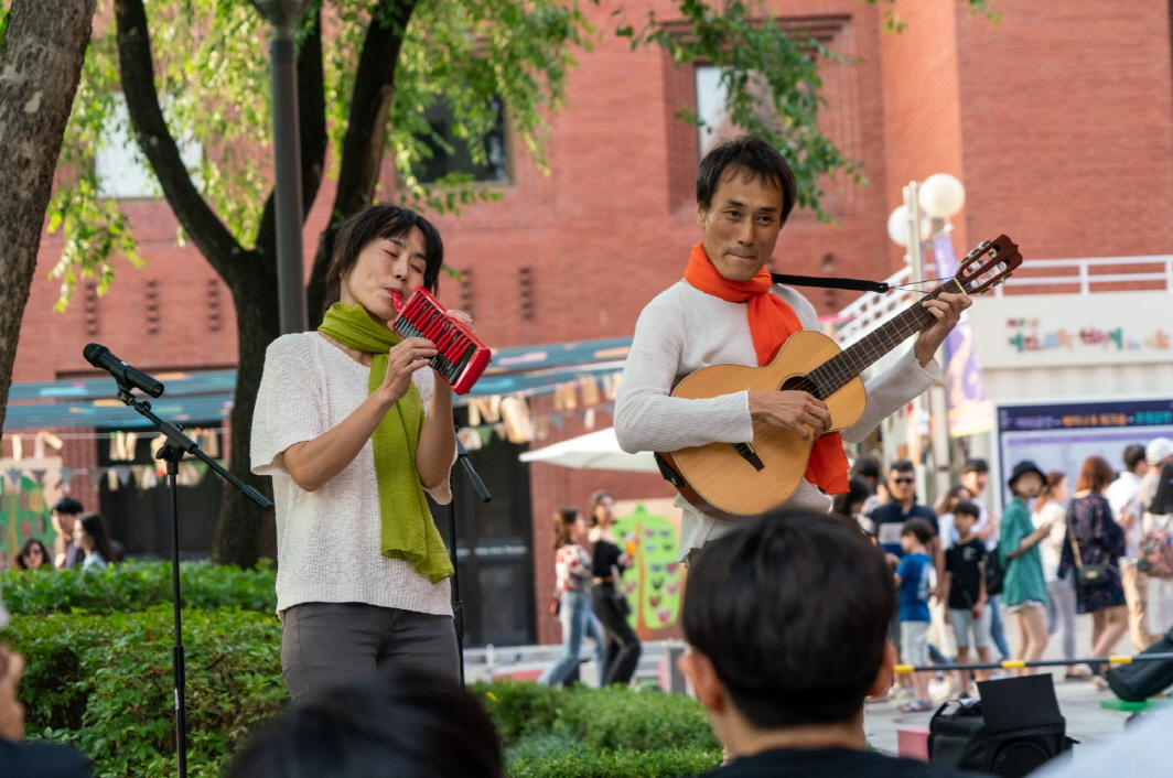 Q. Could you tell me why you have beenperforming outside theaters? What is attractive about non-theatrical spaces?KIM Seung-eon: The rental fee for theaters was a big problem for us. Even if we do have money, a play requires not only two actors but also the staff at the theater. So the size becomes bigger. We wanted to let go of what we had worked on before and find something we could make together. We also wanted to find our own way to perform. When I first understood the concept of a street, it felt refreshing. On the street, I could see things that aren’t found in theaters. AsI didn’t know what they were exactly, I was shocked as well.