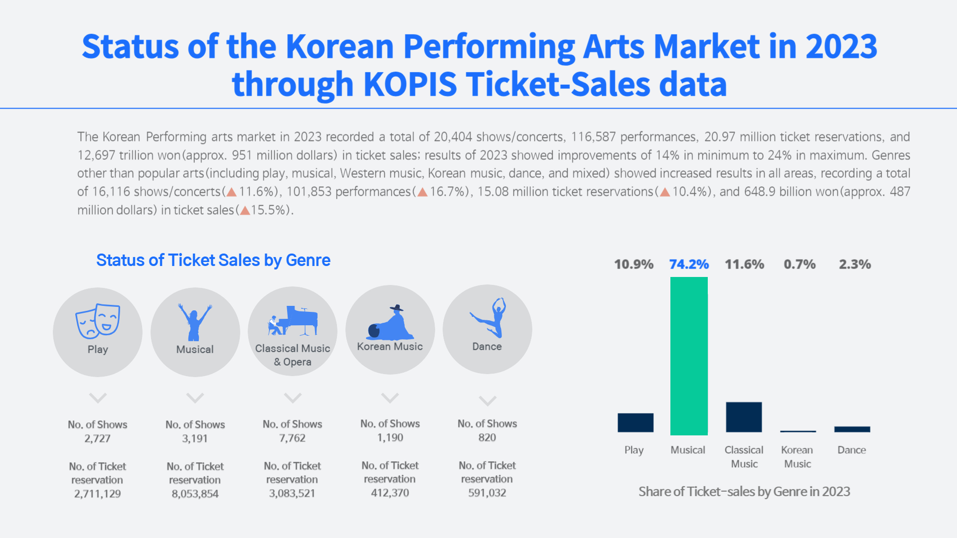 ![]() Korea Performing Arts Box Office Information System_KOPIS released the 2023 Performing Arts Market Ticket Sales Analysis Report. The performing arts data team at the KAMS analyzed ticket sales trends of the Korean performing arts such as play, musical, Western music(classical music and opera), Korean music(gukak), dance(Western/Korean), mixed, popular music, popular dance, and circus/magic collected in the KOPIS from January to December 2023. The Korean Performing arts market in 2023 recorded a total of 20,404 shows/concerts, 116,587 performances, 20.97 million ticket reservations, and 1.2697 trillion won(approximately 951 million dollars) in ticket sales; results of 2023 showed improvements of 14% in minimum to 24% in maximum. |