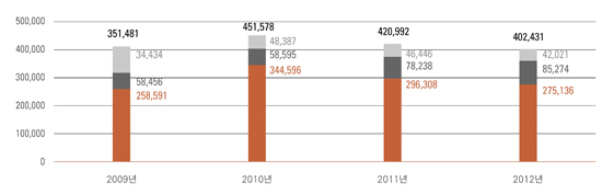 When we examine the actual transactions of artwork by domain without taking into account the overlap between domains, the sum of art sales in the main distribution domain decreased by 4.4% (approximating 18.5 billion won) from 420.9 billion won to 402.4 billion won compared to 2011. The sum of art sales in the public domain decreased by 20.9% (approximating 20.5 billion won) from 98.3 billion won to 77.7 billion won compared to 2011.
