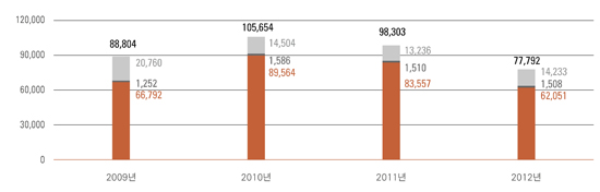 The auction market, which has been consistently on the rise, also showed a similar phenomenon. Two large auction companies with yearly sales over 5 billion hit 63.6 billion in sales (74.6% of the total), marking a 44.5% increase from 2011. But nine smaller auction companies with less than one billion won in yearly sales recorded a drop from 28 billion won in sales in 2011 to 11.8 billion. The average also plunged from 3.1 billion won to 1.3 billion won.
