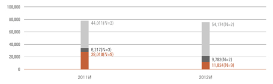 When we examine the main distribution category, gallery sales decreased 7.1% from 296.3 billion won to 275.1 billion won, and art fair sales fell 9.5% from 46.4 billion won to 42 billion won. On the other hand, sales for auction companies have been on the upswing and have offset the decline in the market with sales increasing by 9.0% from 78.2 billion won in 2011 to 85.2 billion won.