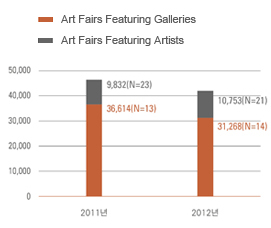 The domestic art market is finding it difficult to shake off the downward turn that began in 2011. The number of visitors to galleries is increasing yearly, but these visits are not leading to sales, so galleries remain largely dependent on profits from existing consignments. Art fairs are yet another sales channel for galleries. However, examining the current status of sales through gallery participation in fairs shows that, though there is a slight increase in the number of pieces sold through domestic art fairs, the total value of sales shows a decrease. This explains how, despite the emergence of medium-sized and larger art fairs in 2012 (the new gallery-based art fairs in 2012 include Artshow Busan, Busan Alternative Market for Art, Art Asia, and Art Gyeongju), the scope of sales at these fairs actually decreased.