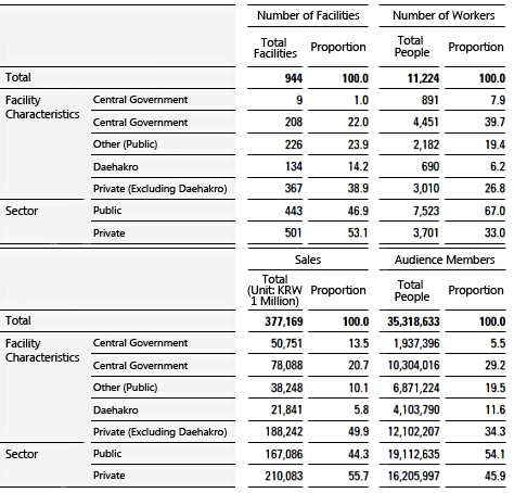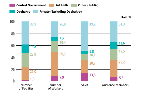 Examining the market share of each type of performing arts facility, private facilities (excluding Daehakro facilities) recorded a higher proportion of sales in proportion to their number than other facilities (taking about a 50% share of the total sales at performing arts facilities).