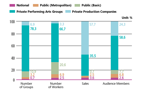 1) Sales from performing arts facilities include internal sources of income (income from admission fees, facility rentals, other performing arts projects, and other business projects) and other sources of income (parking fees, rental fees, interest etc.), and sales from performing arts groups include internal sources of income (sale of performance arts pieces, ticket sales, acting fees including invitation fees, other performing arts projects, and other business projects) and other sources of income (parking fees, rental fees, interest, etc.)