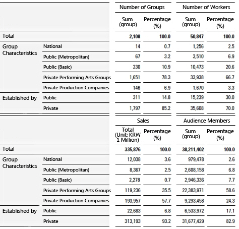 The Performing Arts Conditions Survey categorizes performing arts facilities by their unique characteristics, with government facilities, art halls and other public facilities categorized as public facilities and Daehakro and other (non-Daehakro) private facilities categorized as private. The survey categorizes performing arts groups by the unique characteristics of the group into public groups, including the national, public (regional) and public (local) groups, and private groups, including private production companies and private groups.