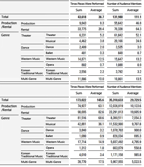 -Out of the major genres of activity, traditional Korean music had the highest average number of performing arts pieces, followed by multi-genre, and Western music. The theater genre had the highest average number of performance pieces, followed by multi-genre and traditional Korean music