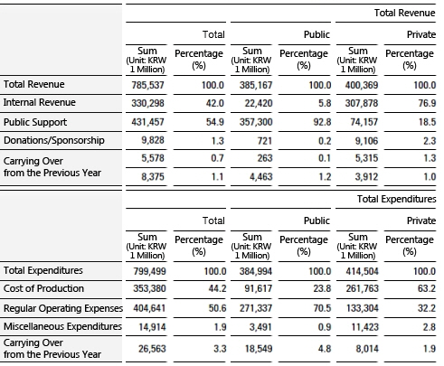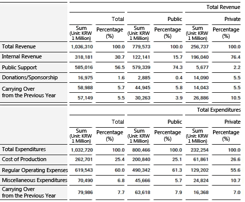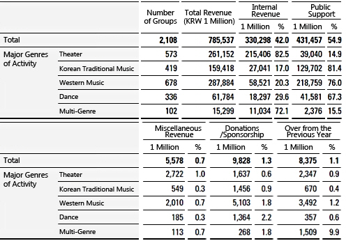 The total income for performing arts facilities in 2012 totaled about 1.363 trillion won (a 5.6% increase from the previous year) and the proportions of public funding and internal income were 56.5% and 30.7%, respectively. Total expenditures added up to about 1.327 trillion won (a 3.3% increase from the previous year) with various administrative expenditures taking up 60% and project fees taking up 25.4%. 73.8% of project expenditures were used for performing arts projects.