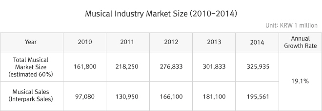 Even though the present research team endeavored to utilize a variety of methods to investigate the musical industry market as a whole, in reality, considerable restrictions prevented this approach. As such, without deviating from research integrity, the 60 percent market share indicated through Interpark ENT’s sales figures was converted to approximate market size. Results further indicated that the musical market was worth KRW 325.9 billion in 2014, an increase of 8.0 percent from 2013. The average annual growth of 19.1 percent over the last five years demonstrated the growth of the local musical market. However, detailed time-series analyses suggested that this growth has been gradually slowing down.
