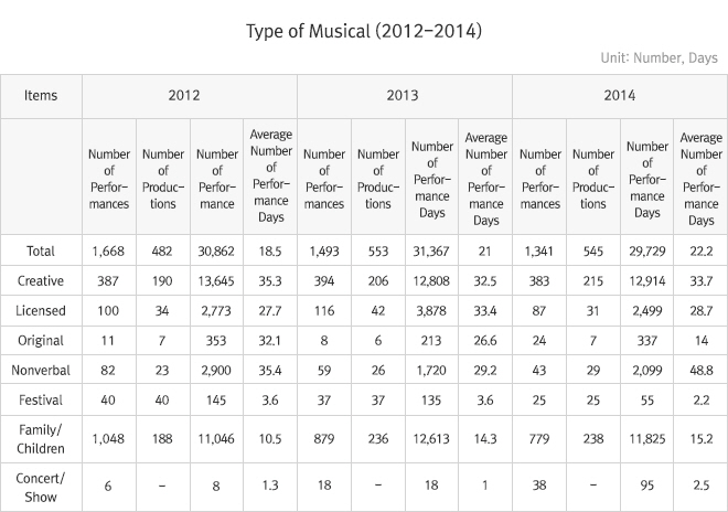 In 2014, 545 musicals were produced, a 1.4 percent decrease from 2013, and a total of 1,341 musicals were performed, a 10.2 percent drop from the previous year. The total number of performance days numbered 29,729, a decrease of 5.2 percent from 2013. On the other hand, the average number of performance days has steadily increased over the last 12 years, with 2014 seeing an average of 22.2 performance days, a 5.7 percent increase from the previous year.