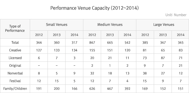 In addition, the number of performing venues for musicals went up by 15, totaling 521 venues in 2014. Among them, 342 were located in the metropolitan areas such as Seoul, Daegu, and Busan, while 179 were in provincial areas, indicating the expanding reach of musicals. No significant differences were surveyed between the numbers of medium and large capacity venues found located in Special/Metropolitan and provincial areas.