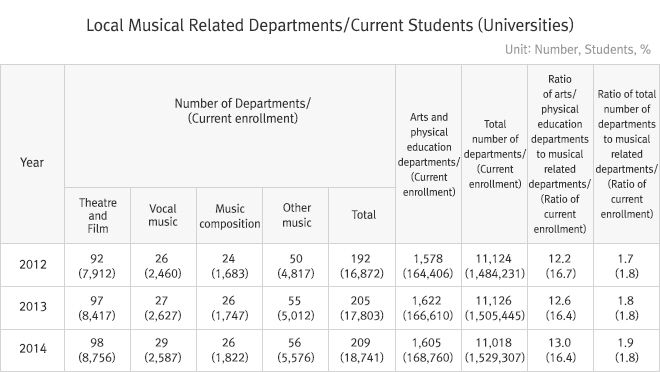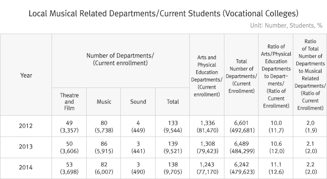 To investigate the area of musical education, 9,705 current students from 138 departments related to musical performance (theater/film, music, sound) in vocational colleges were surveyed. Overall, vocational colleges have seen a decline in total student enrollment since 2012. However, while arts and physical education departments saw a reduction to 77,170 students in 2014, departments related to musical performance have enjoyed increased enrollment since 2012.