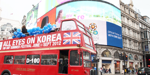 Taking the theme of the five Olympic rings as a starting point, and linking in with the traditional Korean five directions, five elements and five colours, the event was branded in Korean 오색찬란!!, loosely translated as “Five Colours Shining Bright!”. For the consumption of Londoners the festival was branded All Eyes on Korea – a one hundred day festival of K-everything: music, art and literature, film, food and lectures. Posters with colourful Ks could be found across the Underground network publicising the initiative in a memorable way. One of London’s famous red Routemaster buses was even pressed into service to promote the initiative.