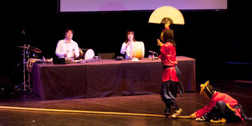 | Be-Being’s percussionists look on as two masked dancers perform a jultagi rope-walk entertainment – one of Korea’s latest UNESCO-listed items of intangible heritage (image courtesy KCCUK) |