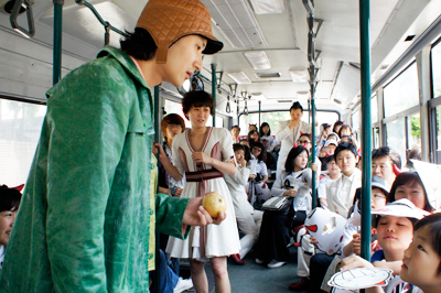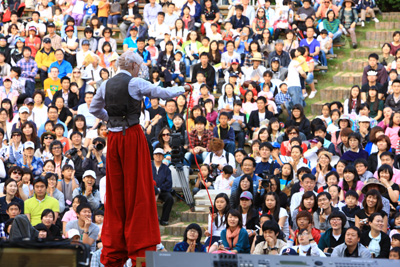 This year marked the festival’s 22nd year. From May 23 to May 30, 90 Korean and 10 international teams from six countries took part. Estimates have the festival attracting 130,000 visitors. Four acts were officially invited as indoor performances. They include Gecko Theatre Limited’s “The Overcoat” (UK), the performers depict the desires and solitude of modern man with live sounds and dynamic movements; Ville Walo & Kalle Hakkarainen’s “Odotustila” (Finland), a piece representing the new circus with harmonious visuals, magic and juggling; Patrice Thibaud & Phillipe Leygnac’s “Cocorico” (France), which is about the joy of mime expressed through body movement and music; and Nottle Company Theatre’s “The Return” (Korea), a satire on the ideology of power. Thank You Tezuka’s “Mime Comedy” (Japan) and Fire Bandit’s “Fire Performance Art” (Japan), which were officially invited outdoor performances, dazzled the audience with innovative moves. Until two years ago, comprehensive genres were reportedly the trend, including free participation pieces, but recently more pieces focus on archetypal body movements. Momggol’s mobile performance was a contender for best outdoor performance and was also very notable.