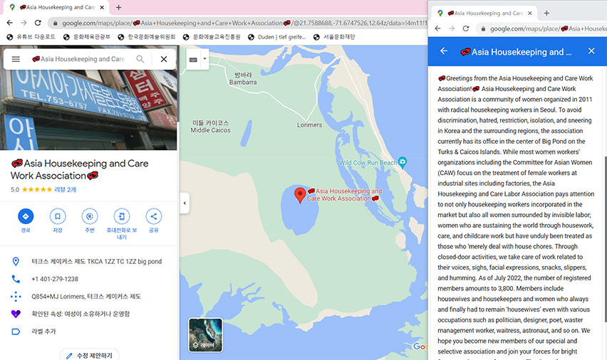 This research created a fictitious association called the Asia Housekeeping and Care Work Association and established its digital base camp within Google Maps, and experimented with and developed effective keywords for international collaboration and circulation. In this process, it tried to create a model that can comprehensively manage the content and implementation of the work as well as looking at how international exchange can be carried out with this model. In other words, it tried to create an international community by experimenting by having the participants as members of an association rather than audience members or staff members. In addition, it went beyond the generally accepted way of doing concept touring, which is based on manuals and scores, to create a finite creative process with a local mediator. It aims to move the “relationship” and “narrative exploration” that the work pursues as a performative process internationally. In addition, in order to compensate for the regional narratives and the alienated and redacted experience that English-centered communication creates, it actively encourages the participation of non-English speaking members who do not speak English well, by providing google Translation services despite the limitations that still exist. Generalkunst’s research sought to realize the Next Mobility from the perspective of solidarity in the era of disaster.