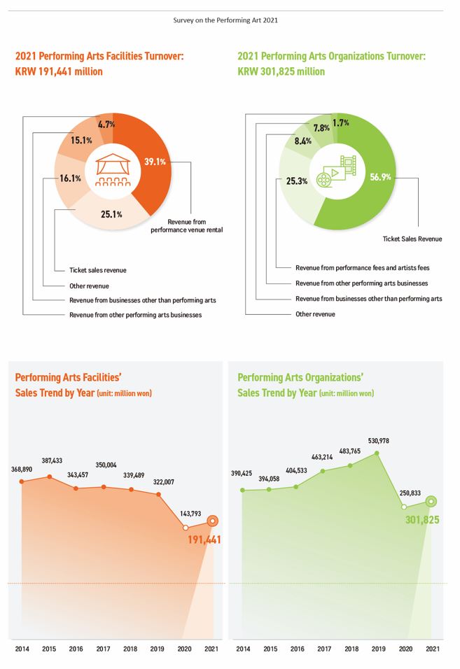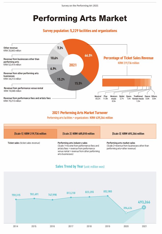 Korea Arts Management Service(KAMS) published a report about the Survey on The Performing Arts in 2021. According to the KAMS, total sales of performing arts in South Korea came to 493 billion won in 2021, up 25% from 2020.