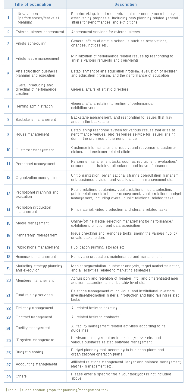 In the view of ''Arts Management'' as an occupation, there is a need to examine if Arts Management -the Arts Management here will be limited to the workforce working in planning services- is included in the Korean Standard Classification of Occupations(KSCO), and the fact is that the jobs that are responsible for Planning Management isn''t yet identified as independent occupations according to KSCO. This fact may reflect the decision that this kind of jobs are unique and isn''t universal enough to be considered as a candidate for independent occupation according to KSCO.