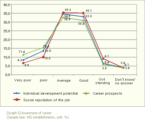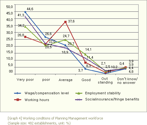 The working conditions of Planning Management workforce in the aspect of wage/compensation level, working hours, job security, and social insurance/fringe benefits was not so good either [Graph 4]. This data is from the Performing Arts Institutions/Organizations. On the other hand, their personal development potential, social reputation of the job, and career prospects were expected to be relatively high [Graph 5]. It was speculated that the latter acted as a kind of compensating difference so that the workforce in the field of Performing Arts kept their occupation as Planning Management workforce even with the relatively poor working conditions.