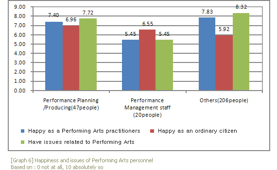 In addition, this report had surveyed whether the subjects were happy as Performing Arts practitioners happy as an ordinary citizen, or had any issues relating to Performing Arts(0~10 point scale imposed). In the case of Performance Planners/Producers, the result showed that they felt less happy as Performing Arts practitioners compared to other workforce, but contrastively, there level of happiness as ordinary citizens were high[Graph 6]. This was also true with the Performance Management staffs as well.