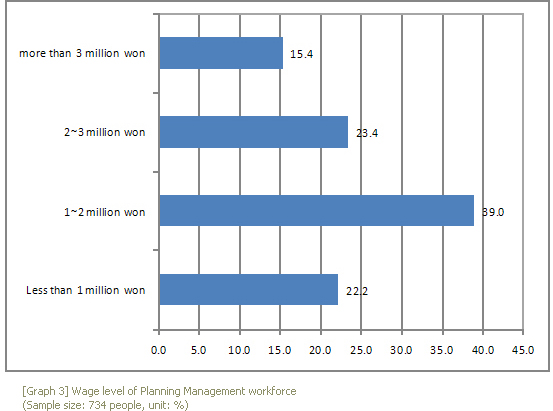 The average wage of the 734 Planning Management workforce were verified through the survey. It was found that the then monthly average wage was around $1,620(1.769 million won), and the distribution from the lowest to the highest wage was found to be from $92(100 thousand won) to $7,640(8.3 million won). Employer''s average wage was around $1,850(2.018 million won), full-time $1,740(1.896 million won), part-time $680(7.42 hundred thousand won), and the day laborer $910(9.92 hundred thousand won). In the distribution view, $920~$1,840(1~2 million won) average wage segment showed the highest ratio. During the in-depth interview, it was found that the lowest wage average for new recruits of small-scaled companies began as low as $550(6 hundred thousand won). In the case of play performers, though not formal Performance Planning personnel, the training members hoping to be actors had worked as assistants and failed to receive wages for their work. In conclusion, majority of the workforce in the field of performance planning had significantly low wages excluding few large-scaled performance theatres or Performance Planning companies, and national organizations of performing arts.
