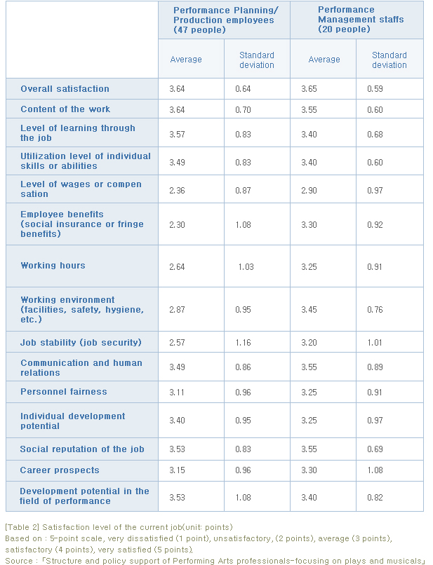 According to the results it can be said that the overall satisfaction(5-point scale) was relatively high with averages of 3.64 points(Performance Planning/Production employees), 3.65 points(Performance Venue Management staffs), and slightly higher 3.68 point average for the other performance artists(206 employees). When we take a look at each of the 14 items, we can see that the satisfaction for content of the employees work, the level of learning through the process of work, the utilization level of individual skills or ability, conversation and human relations, social reputation of the job, and development potential in the field of performance are high; but, the satisfaction level for fringe benefits, level of wage/compensation, and job security were low. Though, this result is from a small sample pool and is confined to the fields of plays and musicals, I think it is safe to assume that it is universal as the overall Planning Management workforce of Performing Arts have pretty mutual level of satisfaction results.