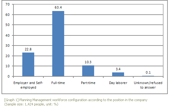 The classification [Table 1] of planning/management services was presented to the target Performing Arts Institutions(Organizations), and had them fill in all of the info about the currently employed workforce in the survey table. Through this survey, I was able to obtain information from 1,424 personnels employed by 482 different establishments. The findings were first, full-time (more than 1 year contract) was 63.4%, employer/self-employed was 22.8%, part-time (more than 1 month and less than 1 year contract) was 10.3%, and day labor (less than 1 month contract) was 3.4%.