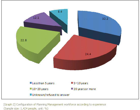 The average experience of the target people were 9.1 years. But, when viewed through distribution, the highest was less than 5 years of experience with 32.2%, then 5~10 years (24.4%), 10~20 years (22.8%), over 20 years came out to 12.1%. At the time of the survey, I also did an interview survey and found cases where performance artists and staffs employed at small-scaled agencies were making transitions into Performance Planning workforce. These transitions from performance to planning field might depend on circumstances such as the current performance being suspended or a shift in the priority of the employee during a helping process of other performance planning. But, there were some cases where people with interest in Performance Planning changing their career from non-related companies. Contrastingly, there were considerable new recruits with less than 6 ~ 12 months of continuous service year.