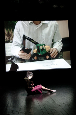 Entering the theater, a huge screen is hung over a relatively small stage. On the left side thereof, JEONG emotionlessly sits with her laptop computer on. The simple design of the stage remains unchanged till the end of the performance. Simplicity, however, is not limited there. Structure-wise, it is more than simple. Sitting almost throughout the one-hour performance, she mostly projects what is on her laptop monitor onto the screen. With those settings behind, the confession quoted at the beginning spins out of her own image projected onto the screen. Her laptop contains numerous video clips, which are projected onto it. The audience keeps silent, but heeds what she says, expecting a possible wild story. The more expectation one has, the likelier the person is to feel like watching something unexpected. The transparent and clever will against ever betraying something is the motif running through Oil Pressure Vibrator.