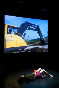 The scene betrays the desire for a sensational story expected by the audience. Then, what lingers in the mind after the performance is over. It may be wrong to tell for sure, but what seems most intriguing to the audience is the projected image of JEONG’s cheerful face when she finally obtains the license for the excavator. Looking at the facial expression, the concept of Freudian humor suddenly dawned in my mind. Freud defines humor as “your emotional state based on the principle of pleasure.” (“Humor”, 1927). As with numerous psychological disorders, what is faithful to principles of pleasure is usually harmful to mental health. Humor, however, does not hurt mental health. Why? Freud answers, “Humor does not relieve your feeling, but encourages you.” In other words, while reality forces agony upon the ego, humor activates some sort of narcissism, leading to a successful self-defense. From the perspective of feminism, it will probably be hard to avoid the criticism that Oil Pressure Vibrator is politically weak. Her joyful face at the moment of obtaining the license delivers a humor about a social mechanism that attempts to subjugate the individual pleasure to a bigger context. Finally, I wish Japan would have more shows like this, in which strategic humor surrounding pleasure are presented in a well-organized way.