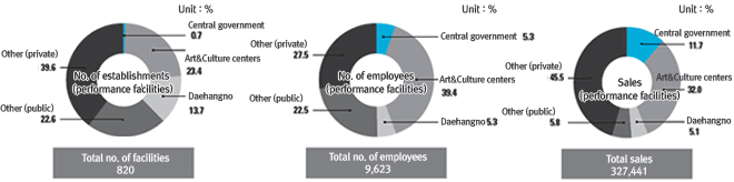 However, in sales, private performing arts facilities took up close to half of the entire sales with 45.5%, and public cultural centers took up 32.0%. In other words, public performance facilities such as central government facilities and cultural centers have a relatively high ratio in number of employees and sales compared to the number of establishments, but facilities in Daehangno have relatively low ratio in number of employees and sales compared to the number of establishments. Other public facilities (other than national and local government operated cultural centers) were found to have high ratio of establishments and employees, but relatively low ratio in sales. The ratio of establishments, employees, and sales for private facilities were found to be high overall, but the number of employees was low whereas sales was high.