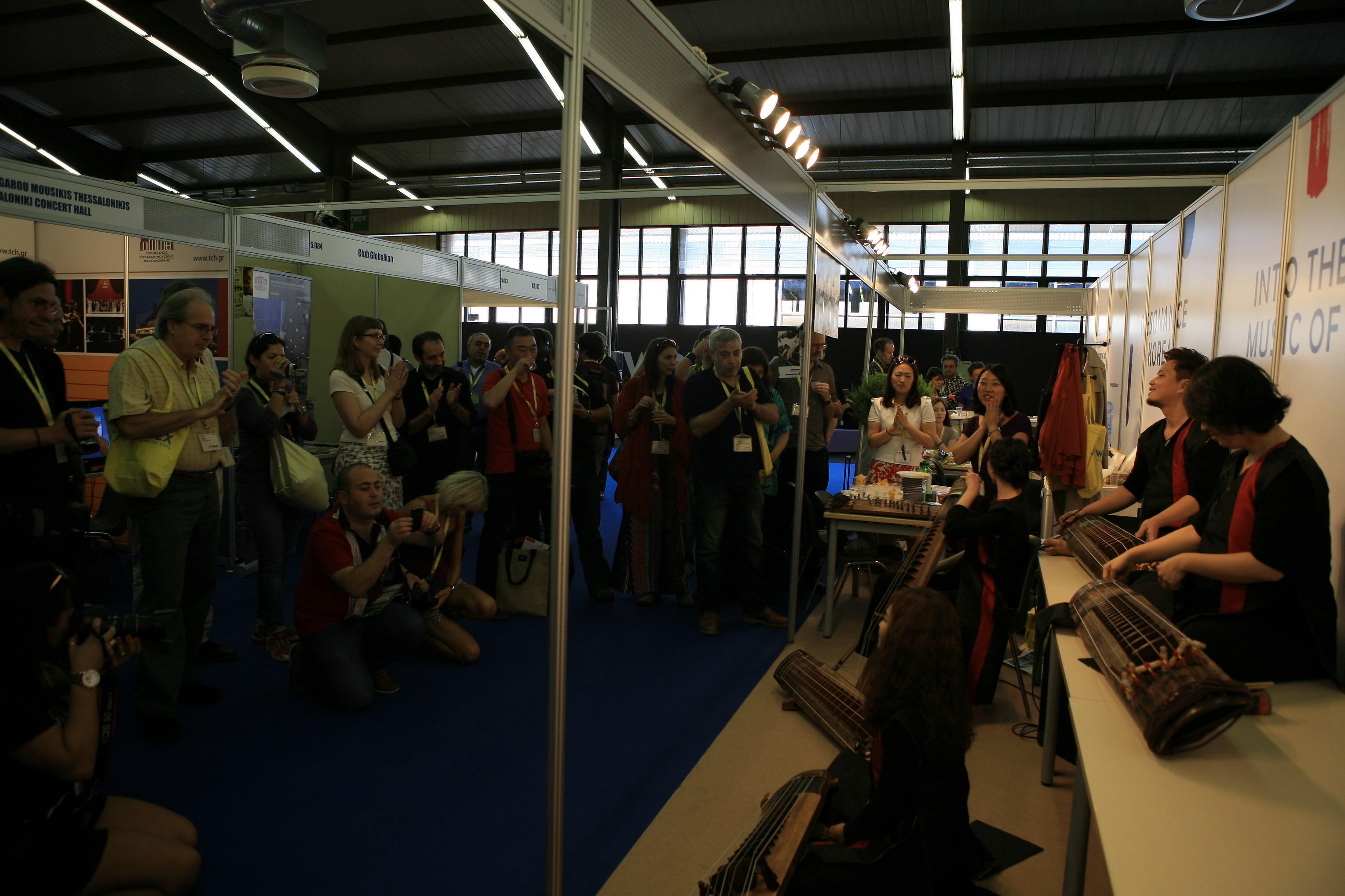 A trade fair was also held during the daytime throughout the three days of WOMEX. 600 organizations from 40 countries participated in the fair with 245 booths on display. The booths were installed on the first floor of two buildings. The exhibition halls were so spacious that it wasn''t even easy to look around all of the booths. Since there were so many booths, several booths were combined together to form a large national pavilion. This year, 10% or 26 out of the 245 booths belonged to the national pavilions of Korea, Brazil, the Nordic countries and Turkey. Some booths were decorated in a way that emphasized the country''s characteristics and others promoted themselves by opening a café or a bar. As for the booths belonging to a national pavilion, all representatives from the same country shared the same space. It is more efficient than having separate booths. Since it costs so much for individual organizations to install their own booths, public resources are used to enhance efficiency and lessen their financial burden. This year, the Korean pavilion was shared by Jeong Ga Ak Hoe (Minyoung KIM), Esternox (Seokjin LEE), Cheong Bae Yeon Hi Dan (Sujin LEE), Gamin (Hyoseon KANG), Geomungo Factory (Juik PARK), Nae Deu Reum (Gudae KIM) and the Ulsan World Music Festival (Jeongheon LEE and Min-kyung KIM). Using a national pavilion, however, does have some disadvantages. Deulsori, another Korean group, ran its own booth separately from the Korean pavilion. The group seems to have made such a decision in order to promote itself more effectively because negotiations about potential performance tours mostly take place in a booth. Moreover, Deulsori has participated in WOMEX and in overseas markets for several years so it has significant knowhow and personal connections. Thus, it was an effective strategy for the group to have a separate booth, distinguishing itself from other Korean groups.