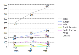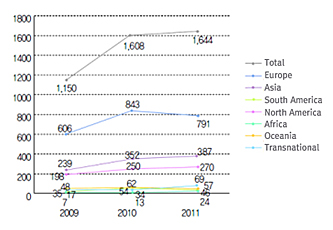 The characterizing feature of the international activity of domestic performing arts groups in 2011 was that the number of North American performances decreased while simultaneously increasing in other continents in a consistent upward trend. The increase in performances in the Oceania area in 2011 is particularly noticeable. This trend can be attributed to the 50–year anniversary of South Korea–Australia relations and the resulting commemorative events and spike in the overall number of cultural exchanges. The activity for international performing arts groups performing in South Korea increased except for those from Europe, which showed a 6.2% decrease from the previous year.