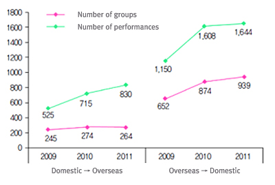 The count for the international activities of domestic performing arts groups in 2011 came to a total of 830. The total count for the domestic activities of international performing arts groups came to a total of 1,644. The number of domestic performing arts groups who engaged in international activity was 264, showing a decrease from 2010, but the number of performances, at 830, demonstrated a 16.1% increase from 2010. On the other hand, the number of international performing arts groups that performed in Korea came to 939, showing a 2.2% increase from 2010.|