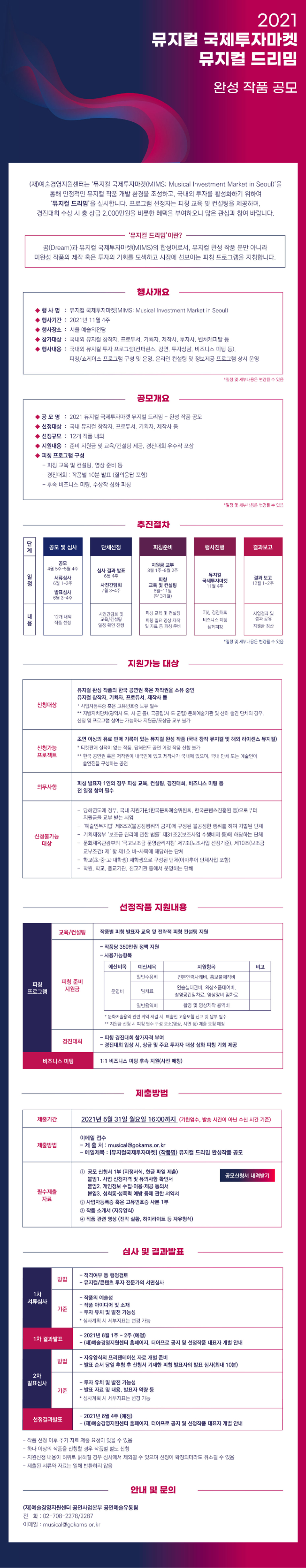 2021 뮤지컬 국제투자마켓 뮤지컬 드리밈 공모 기간을 5월 31일(월)로 연장하오니 많은 지원 부탁드립니다. |