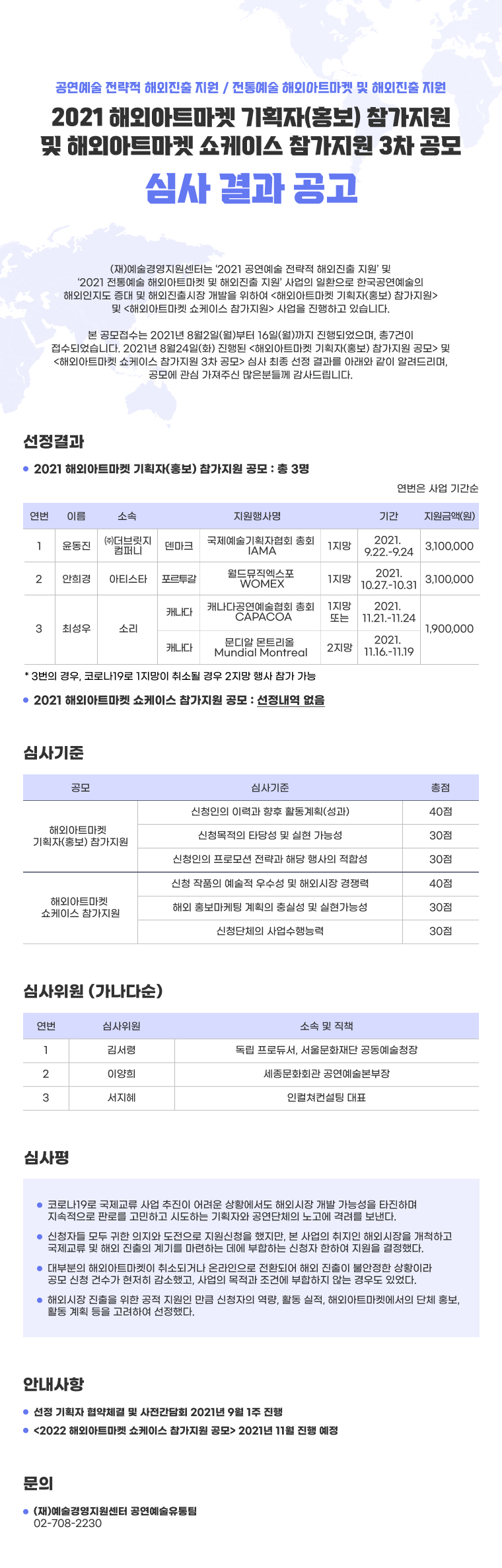 2021 해외아트마켓 기획자 및 쇼케이스 참가지원 공모 선정결과 안내