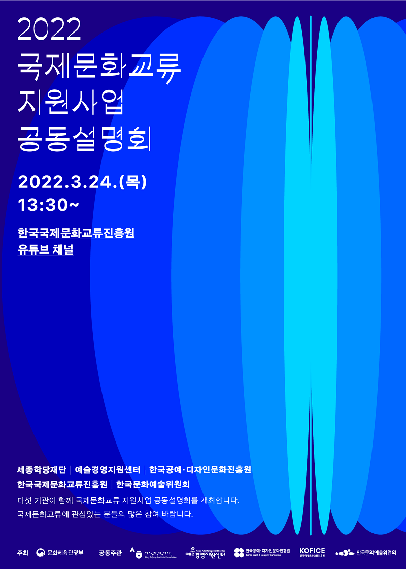 ㅇ 행 사 명: 2022년 국제문화교류 지원사업 공동설명회 ㅇ 개최일시: 2022년 3월 24일(목) 13:30 ~ 16:30 * 3시간 이내 개최 예정 ㅇ 장소: 국립중앙박물관 대강당 ㅇ 방식: 상기 장소에서 실시간 발표, 온라인 상영 ※ 진흥원 유튜브 채널 (https://www.youtube.com/c/koficeculture) ㅇ 주요 내용: 주관기관의 2022년도 지원사업 안내 ㅇ 대상: 문화 분야 국제교류 지원사업에 관심 있는 누구나 ㅇ 주최: 문화체육관광부 ㅇ 공동주관: 세종학당, 예술경영지원센터, 한국공예디자인진흥원, 한국국제문화교류진흥원, 한국문화예술위원회 (기관명 한글 가나다순) |
