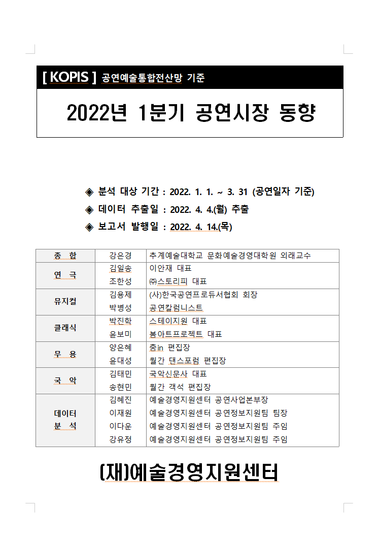 [KOPIS] 공연예술통합전산망 기준 2022년 1분기 공연시장 동향 O 본 보고서는 공연예술통합전산망(KOPIS)의 데이터 분석 결과와 공연 장르별 전문가 11명의 현장에 대한 통찰을 - 공연예술통합전산망은 연극·뮤지컬·클래식·오페라·무용·국악·복합 7개 장르로 구분되고 있으나, O 「2022년 1분기 공연시장 동향」은 2022년 4월 4일 기준으로 2022년 1월에서 3월까지 기간의 공연일자 기준 O 매일 단위로 예매·취소 값이 발생하는 공연예매데이터 특성으로 인해, 데이터 추출일자가 다를 경우,