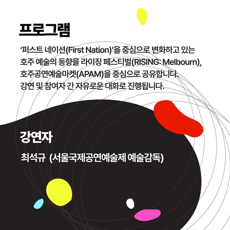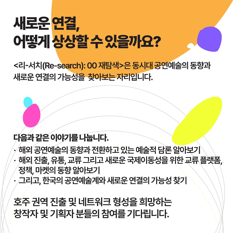 | File | 2023 해외 공연예술계 동향 공유회 <리-서치(Re-search): 호주 재탐색> ⇒ 신청하기 ![]() ![]() ![]() ![]() |