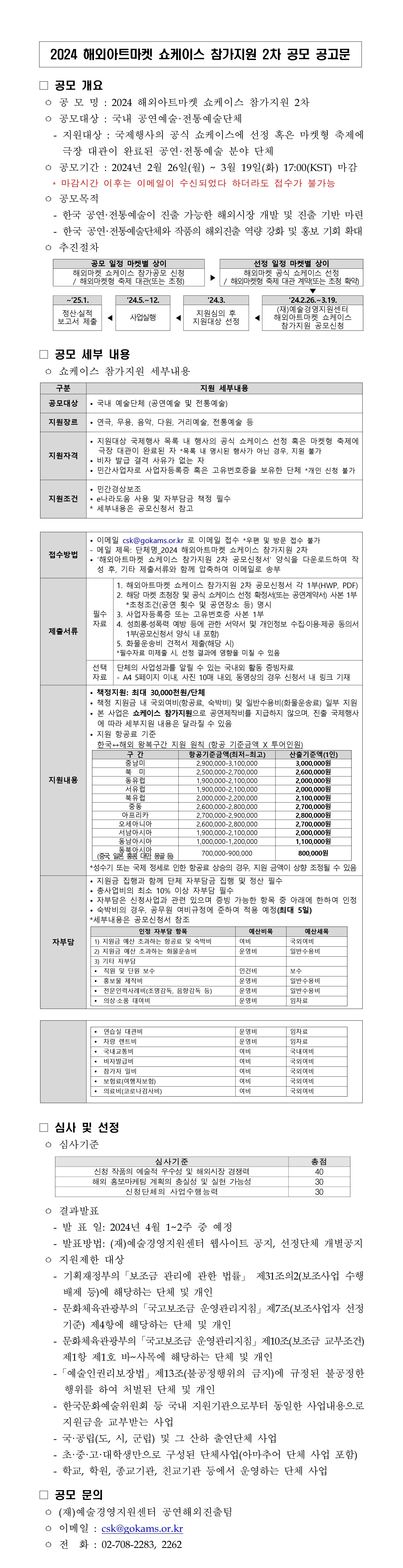 [양식] 2024 해외아트마켓 쇼케이스 참가지원(2차) 공모신청서(2).hwp 2024 해외아트마켓 쇼케이스 참가지원(2차) 공고문(1).pdf 2024 해외아트마켓 쇼케이스 참가지원 대상 국제행사 목록(2).pdf |