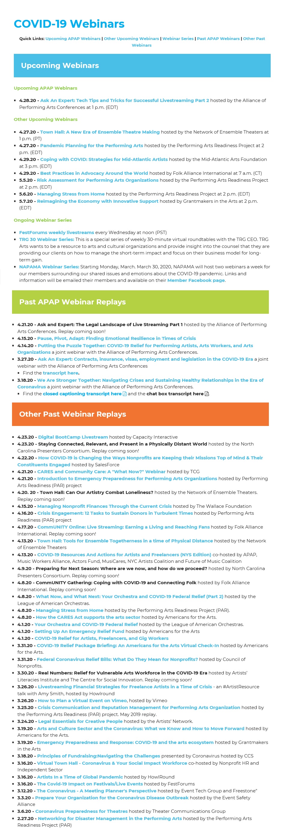 미국 공연 기획자 협회 APAP(Association of Performing Arts Professionals)에서 코로나19에 대한 공연예술계의 다양한 이슈를 다루는 웨비나를 아래와 같이 개최 중이다.