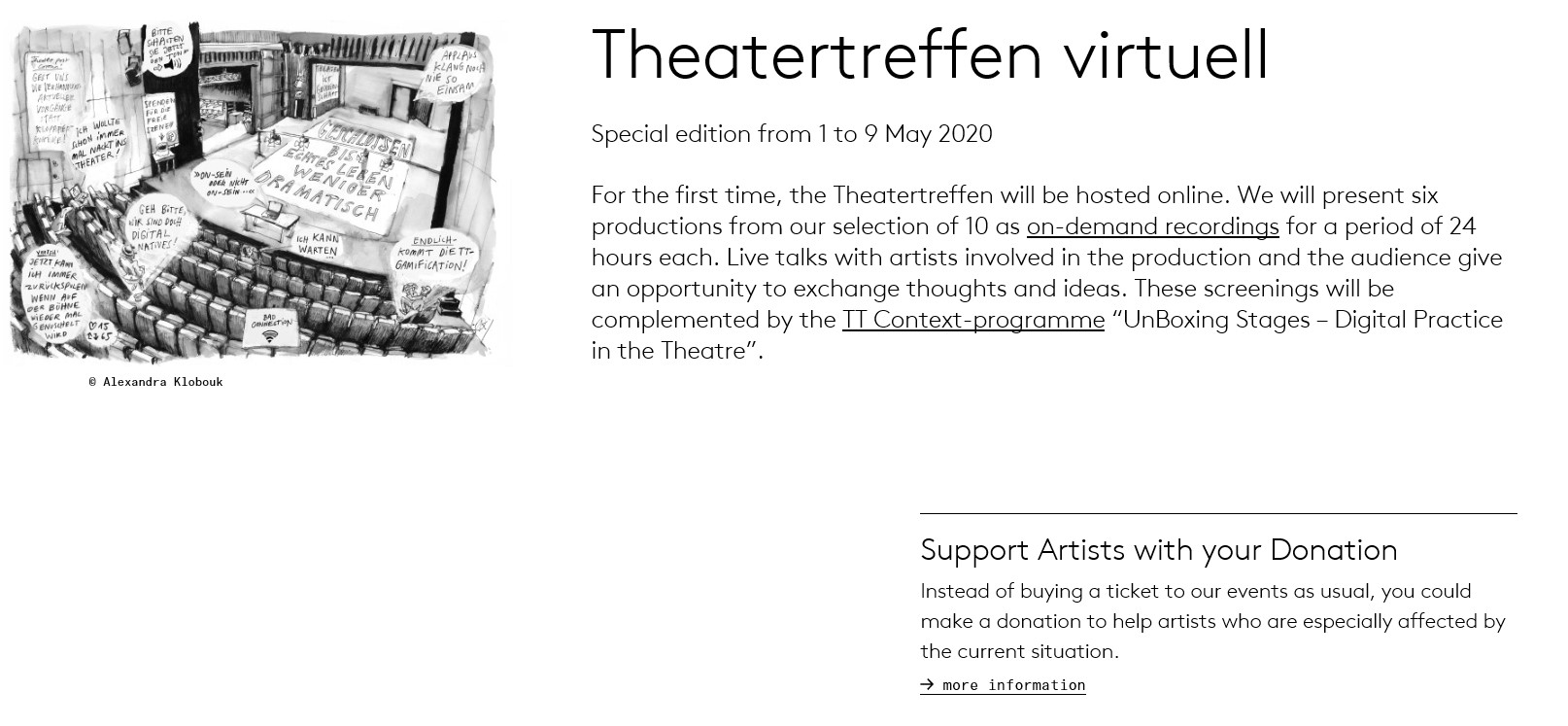 매년 5월 베를린 개최되었던 베를린 연극축제(Theatertreffen)가 코로나19의 영향으로 취소되었다.